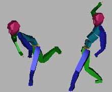 Virtual DanceA report based on the Riverbed Residency in UCI Motion Capture StudioBy Scott deLahunta, May 2001 CONTEXT FOR A MOTION CAPTURE RESIDENCYThe Riverbed Residency took place from 9-20 April 2001 in the Motion Capture Studio in the Music and New Media Building at the University of California, Irvine, Claire Trevor School for the Arts. I arrived as an observer at the beginning of the second week. The artists-in-residence were Paul Kaiser and Shelley Eshkar of Riverbed Digital Arts (http://www.riverbed.com) and Michael Girard and Susan Amkraut of Unreal Pictures (http://www.unrealpictures.com). These artists are well known in the dance field for using digital motion capture and animation technologies to create "Hand Drawn Spaces" (1998) and "Biped" (1999) with Merce Cunningham and "Ghostcatching" (1999) with Bill T. Jones. This residency at UCI's Motion Capture Studio provided them the unique opportunity of working in a non-commercial environment to capture/ gather material for their upcoming new work, an installation titled "Pedestrian". In the UCI Motion Capture Studio, they worked without the pressure of time deadlines and the hard concrete floors of commercial capture facilities and with the readily available skills and passions of dance artists. In return, they opened up their creative process in the studio, gave classes and lecture demonstrations to faculty and students of the Dance, Studio Art and Music Departments and an open public lecture on April 18th in Winfred Smith Hall on the UCI campus. The Residency was organised by Lisa Naugle, Assistant Professor in the Dance Department with support from a grant from the Chancellor's Distinguished Fellows Research Program. Professor Naugle has been with UCI's Dance Department for three years during which time she has been involved in the introduction of a range of new courses and collaborative projects featuring different technologies into the UCI Graduate student curriculum including Active Space/ Interactive Performance Systems and telematic projects of varying descriptions (see her website for details http://www.arts.uci.edu/lnaugle). In 1998, she began to conduct classes in motion capture at an off-site location as part of an Internship Program with a local motion capture house. One of her first students, Amy Cady, completed her graduate thesis project in 1999 focusing on motion capture technology and its ability to represent Rudolf Laban's Space Harmony theory (see http://www.arts.uci.edu/abcady/thesis.htm), and additional graduate research is underway, i.e. Irma Castillo's thesis in Choreography and Motion Capture. In 1999, the UCI's Claire Trevor School for the Arts installed their own motion capture system (the optical Vicon 8 http://www.vicon.com) to be integrated into the evolving interdisciplinary arts and technology curriculum with a particular focus on use by the Dance Department (as far as I am aware the first motion capture system in the world to be dedicated to a university dance department). This evolving curriculum already contained digital arts courses given by Dance Department Professors Mary Corey, who has taught a graduate dance course in interactive multimedia design for CD-ROM since 1997, and Alan Terricciano, who offers a digital sound course for graduate dance students as well as web design classes. Adding to this base, Professor Naugle and Professor Christopher Dobrian of the Music Department have organised and are advising interdisciplinary projects involving dance, music and computing science and engineering students some of which are now involving the new motion capture system, e.g., Frédéric Bevilacqua, a composer and computer scientist working at UCI as a post-doc at the Beckman Laser Institute, is collaborating with Professor Naugle on mapping motion capture points from a human figure animation via MAX/MSP to a variety of musical parameters. Currently, the School for the Arts is investigating the possibility of someone joining the faculty who will assist in integrating digital 3-D figure animation into the arts and technology curriculum - a process that has gained momentum as the result of the Riverbed Residency. The success of the Riverbed Residency has led immediately to the planning of future artists residencies as well as inter-institutional partnerships with other dance departments such as Ohio State University (recently equipped with a new motion capture studio), and the Dance Department is preparing for several new graduate students to focus specifically on motion capture and animation. With all of this activity, the UCI Motion Capture Studio seems poised to make a major contribution to the integration of choreographic and dance practice with developments in the area of human figure motion analysis, synthesis and animation. A more detailed description of the UCI Motion Capture Studio and some of the current and future projects and plans including curriculum development, residencies and workshops, etc. are available on this site. For more information about the work of Riverbed Digital Arts and plans for the "Pedestrian" installation and other work, please visit their site: http://www.riverbed.com. Paul Kaiser maintains this website which features current projects, an archive of past work and various papers he has written including valuable transcripts of interviews with some of his collaborators, including Michael Girard and Susan Amkraut (see details about accessing this interview below). I strongly recommend this particular interview as essential reading for anyone who finds motion capture and figure animation interesting as it provides insight into their early ground breaking contributions to the field. CAPTURING MOTION FOR PEDESTRIAN"Pedestrian" is scheduled to premiere in the autumn of 2001 in New York City. It is intended to be a film of about 12 minutes in length projected in a public installation setting in the guise of a street lamp casting its light (in this case a projection) on