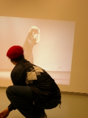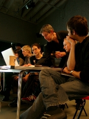 Laban London presents:THE INTER-PRACTICE LAB (IPL)The pictures on these pages are from the lab which has now finished. Caitriona Price, our documenter, took most of the images, and there are some more here. In the future, we may put additional documentation material on line and a short report. (if you are on a fast connection you can click here to see this page and the pictures at a higher resolution) 5-12 April 2004An eight-day intensive in choreographing relations between bodies, spaces, and electronic and digital media materials; aiming to make fruitful use of these materials both as objects and media in dialogue with movement. This lab began with the simple but considered use of live video camera, performer and video monitor and evolved over the eight days to eventually integrate projectors, real time and pre-recorded media content, mulitiple images on stage and various software tools (Isadora and Eyesweb). The main criteria for participation was a strong artistic practice, and curiosity about, but perhaps little or no experience with the use of electronic and digital media. A 'non-specialist' approach to the media tools and equipment was key to the aims of this lab, although there was the opportunity to develop a level of skill in the use of selected software. Participation was by invitation and drew together a small group of Laban's in-house artists and experienced independent professionals from outside. The Inter-Practice Lab was curated by Scott deLahunta and facilitated by New York / Amsterdam based choreographer Susan Rethorst, New York based dance and media artist Mark Coniglio and artist/ engineer Zachary Lieberman. IPL Participants: